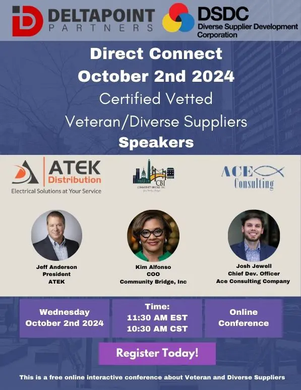 DeltaPoint Partners & Diverse Supplier Development Corporation are proud to announce our next 2024 Direct Connect Webinar to introduce you to three of our Qualified, Diverse, Certified & Contract Ready “Vetted” Suppliers!
